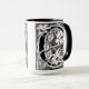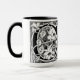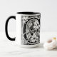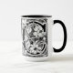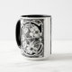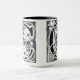 Eine große Blume Weinrebe hat sich um diesen Hauptstadt-Buchstaben 'C' gewickelt. Die Blume sind groß und sehen aus, als wären sie eine Art Lilie. Es gibt auch Blätter und Blume Knospen auf dem Weinstock. Der Hintergrund ist komplett mit schmalen Schwarz-Weiß-Linien bedeckt, die Drehung und Kurve bilden und den ganzen Raum um dieses wunderschöne, verzierte Monogramm füllen.