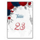 Romantische dunkelrote und marineblaue Blumen mit silbernen Blätter botanische Hochzeitskarte Tischnummer. Die Einzelheiten des Glitzer werden simuliert.