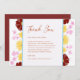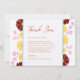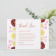 Die Vorderseite zeigt eine klassisch elegante Hochzeitskarte in Terrakotta verbrannte orange Typografie mit einem Blumenrahmen, der bordeauxfarbene, rosa und gelbe Blumen enthält. Das Design ist bunt elegant und zeigt die Freude an der Feier. Diese Dankeschön-Karte ist extrem einzigartig und definitiv faszinierend. Mit dieser äußerst speziellen und lebendigen Karte bedanken Sie sich bei Ihren Gästen.