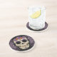 lila Blumen mit einem weiblichen Schädel auf einem Sandstein-Untersetzer