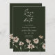 Blumen und Grün Save the Date. Dieses stilvolle Save the Date besticht durch seine schöne handbemalte Aquarellfarbe mit schick-braunen Blume auf dunkelgrünem Jägerhintergrund. Text ist Sahne. Auf der Rückseite der Einladung befindet sich das gleiche Kunstwerk. Finden Sie passende Artikel in der dunkelgrünen und blühenden Hochzeitskollektion.