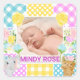 Dieses süße Baby-Ankündigungsdesign zeigt ein friedliches Foto eines Neugeborenen, das von einer weichen, pastellfarbenen floralen Patchwork-Collage eingerahmt wird. Der Patchworkrahmen vereint Gingham, Polka-Punkte und zarte Musterblöcke in Rosa, Blau, Gelb und Lila, akzentuiert mit charmanten illustrierten Blumen und niedlichen Charakter-Motiven. Die Mischung der Texturen erzeugt eine sanfte, handgefertigte Atmosphäre mit einer warmen, verspielten Stimmung. Perfekt für Geburtsanzeigen, Kinderzimmereinrichtung oder Geschenke zum Andenken, kombiniert dieses Design weiche Farben, spielerische Details und herzlichen Charme.