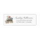 Ein charmantes Versandlabel mit Rücksendeadresse, inspiriert vom Thema "Ein neues Kapitel beginnt", perfekt für eine Babyparty oder ein Brautabschiedsfest. Auf der linken Seite ist ein Wasserfarben-Stapel aus drei Büchern in Tönen von Beige, Grau und Grün mit zarten Wildblumen und Grünzeug in sanftem Rosa, Gelb, Blau und Lila akzentuiert, was einen fröhlichen, märchenbuchinspirierten Touch hinzufügt.