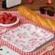 Diese Papierplatte ist in einem schönen rosa Blütendruck dargestellt. Passen Sie dieses Objekt an oder kaufen Sie, wie es ist. Stock Print freepik.com