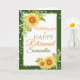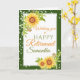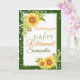 Eine schöne Sonnenblume Retirements Herzlichen Glückwunsch Karte mit Aquarell blühende gelbe Sonnenblumen, Blattwerk und Saitenleuchten mit einem dunkelgrünen Rand. Die perfekte Art, Glückwunsch zu Ihrer Kollegin und Freunden zu sagen, während ihrer Pensionierung. Personalisieren Sie Ihre Daten mit Namen und Insider-Nachricht.