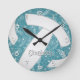 Diese leyball-thematische Wanduhr zeichnet sich durch das realistische Bild eines Volleyballs aus, mit aquamarin- und weißlichen Tafeln, die ein doodle Muster aus Pisleys, Blume und Federn in Weiß aufweisen, die die aquamarinen Paneele des Volleyballs bedecken, sowie überlagerte Uhrengesichtsziffern - personalisieren Sie den Namen des Athleten - durch katz_d_zynes