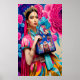 Ein Bild einer Blumenprinzessin mit Handtasche, Goldgürtel, Schmuck und Krone.