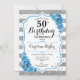 Elegante, florale, weibliche 50. Geburtstagseinladung mit Ihrem Foto auf der Kartenrückseite. Glam weißes, staubblaues Aqua-Design mit Imitaten Glitzer Silber. Die Zierleisten sind Streifen, hellblaue türkisfarbene Rose, Script-Schriftart und Konfetti. Ideal für ein stilvolles Party für Erwachsene. Personalisieren Sie Ihre persönlichen Daten. Kann für jedes Alter angepasst werden! Gedruckte Zazzle Einladungen oder Sofortdownload digitalen druckbaren Vorlage.