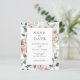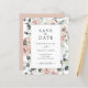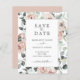 Elegante Blumen-Budget Hochzeit Save the Date mit einem Rahmen bestehend aus Aquarell bemalten Rose in staubigen Rose Rosa und Grün in den Schattierungen von Salbei grün. Dieses schöne botanische Thema Nicht-Foto Save the Date ist Teil einer Sammlung, die ideal für eine Frühjahr-oder Sommerhochzeit ist.