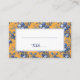 Dies ist eine charmante und elegante Tischnummernkarte mit einem lebendigen orangen Hintergrund, der mit komplizierten blauen Blumenmustern verziert ist. Der zentrale weiße Bereich bietet eine einladende Fläche für die Personalisierung, perfekt, um Ihre eigene Note zur Hochzeits- oder Event-Dekoration hinzuzufügen. Die zarte Schriftart verleiht eine anspruchsvolle Note und macht sie sowohl funktional als auch ästhetisch ansprechend. Ideal, um ein einheitliches und stilvolles Thema bei jeder Zusammenkunft zu schaffen.