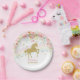 Papierplatte des herrlichen Unicornthemas, die weiblichen rosa Watercolor-Rosen- und -Imitatgoldconfetti kennzeichnet