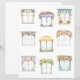 Ein Blatt mit bezaubernden Ausschnittbildern mit vintage-inspirierten Fenstern, die mit üppigen floralen Akzenten und zarten Vorhängen drapiert sind, jedes einzelne in ein weiches, ätherisches Licht getaucht. Jedes Fenster fühlt sich wie eine winzige Vignette aus einem Bilderbuch an - quadratische Rahmen, verwitterte Scheiben und sanfte Kaskaden von blühenden Blumen und rankender Grünpflanzen, die mit anmutigem Charme über die Kanten quellen. Die floralen Vorhänge fügen einen Hauch von Eleganz aus einer anderen Welt hinzu, ihre Muster sind subtil beleuchtet, als ob sie vom Morgenlicht berührt würden.