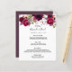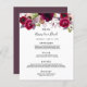 Eine elegante bohemianische Hochzeitskarte. Die Rose sind in Rosa und Bordeaux gehalten. Vorlagen für Ihre Namen, Datum und das Hochzeitsmenü. Weißer Hintergrund vorne, Kaskade, tief lila auf der Rückseite. Schwarze Buchstaben.