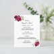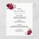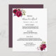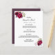Eine elegante bohemianische Hochzeitskarte. Die Rose sind in Rosa und Bordeaux gehalten. Vorlagen für Ihre Namen, Datum und das Hochzeitsmenü. Weißer Hintergrund vorne, Kaskade, tief lila auf der Rückseite. Schwarze Buchstaben.