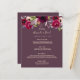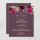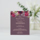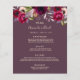 Eine elegante bohemianische Hochzeitskarte. Die Rose sind in Rosa und Bordeaux gehalten. Vorlagen für Ihre Namen, Datum und das Hochzeitsmenü. Cassis Hintergrund auf der Vorderseite, Cassis, tief lila auf der Rückseite. Goldene Buchstaben.