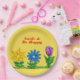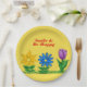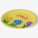 Hübsche Blume im Grünen mit goldgelber Blume, blauer Blume und lila Tulpe mit grünen Blätter. Mit der Formulierung, Lächeln und in rotem Text glücklich sein. Teller zum Einweg-Papier im Frühling und Sommer. Verlass oder personalisiere oder lösche Text. Auf einem hübschen gelben Hintergrund angezeigt. Original Grafikarbeit von TamiraZDesign.