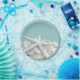 Teller mit Meeresmotiv und Seestern und Hydrangea-Design. Blau mit Stern und Blume und ohne Text, diese Teller in zwei Größen. Nutzen Sie die Gelegenheit für eine Geburtstagsfeier oder jede Feier mit Strandthema.