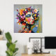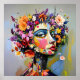 "Blumengeometrie" - Ein botanisches Portrait. Ein faszinierendes Treffen von mosaikartigem Design und üppiger Blumenpracht prägt dieses Werk. Der durchdringende Blick der Frau kontrastiert mit der Weichheit der Blüten und schafft ein Gleichgewicht zwischen Präzision und Chaos. Eine lebhafte Farbpalette aus Rosa, Gelb, Lila und Rot hebt die Verbindung zwischen Struktur und Bio hervor und liefert ein modernes, unvergessliches Portrait.