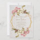 Diese geometrische Blumen-Hochzeitseinladung kombiniert mehrere Trends des Jahres 2019: geometrisch, Marmor und metallisch (goldfarben). Sein unregelmäßiger Rahmen hat weiße und rosa Blume, die sich über zwei Goldpolygonen mit Overlay auf- und absetzen. Die Namen der Braut und des Bräutigams sind in einem eleganten kalligrafischen Skript geschrieben, das auch für die letzte Zeile verwendet wird. Die Vintagen rosa und weiße Blume stammen aus einer Vintagen Postkarte von Bertha Maguire (1862-1910), die nun im öffentlichen Bereich erhältlich ist.