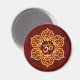 Ein Om- oder Om-Design sitzt in einer stilisierten Lotus-Blume. Das kreisförmige Muster ist mit einem goldgelben, hervorgehobenen Farbton gefärbt, um auf der Oberfläche ein helles Licht zu erzeugen. Der Hintergrund ist tiefrot gestrichen, was durch den negativen Bereich der Blume zu sehen ist. Ein Schatten erscheint direkt unter dem Design, sodass er gerade über der Oberfläche des Magneten zu schweben scheint. Dieses stilvolle Design ist eine auffallende Darstellung dieses spirituellen Symbols.