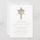 Diese elegante Taufveranstaltung mit einem Aquarellbouquet aus Elfenbein, Rose goldgrün und Eukalyptusgrün auf einem einfachen Holzkreuz, oberhalb der Worte "Bitte schließen Sie uns für die Taufe unserer Tochter" in braunem kursivem Schriftart. Personalisieren Sie es mit ihrem Namen in grüner, zarter Handschrift Kalligraphie, mit den Details in braunen Sans Serif Schriftart auf einem weißen Hintergrund. Ideal für die Taufe eines Mädchens.