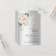 Ein Imitat silber aussehender Hintergrund. Weiße Blume, Blumen, Eukalyptusgrün und goldenes Kreuz. Personalisieren und fügen Sie einen Namen und Details.
