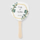 Das ist elegante Blatt-und Blume-Kranz-Design Hochzeit Einladung Hand Fan. Dieses Design mit einem zarten Kranz aus Blattwerk in Elfenbein, Minze und Gold.