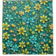 Ein lebendiges Muster von stilisierten Gelb- und Blautönen ist Set vor einem reichen aquamarinen Hintergrund. Verschiedene grüne Blätter ergänzen die bunten Blüten und schaffen ein harmonisches und dekoratives Design.