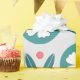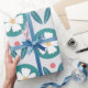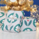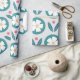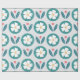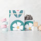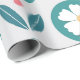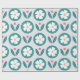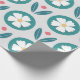 Ein raffiniertes Muster mit zarten, weißen Blume, die in aquamarinen Kreisen eingefasst sind, ergänzt durch stilisierte grüne Blätter und weiche rosa Punkte. Die gepflegte geometrische Anordnung verleiht dem Ganzen eine Touch von Eleganz und Ausgeglichenheit.