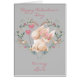 Hier ist eine bezaubernde Valentinstag-Karte, die entweder für eine Frau oder einen Mann angepasst werden kann. Die Vorderseite hat ein Bild von zwei niedlichen Hasen in einem herzförmigen Blumenkranz. Einer der Bollen hält zwei kleine herzenförmige Ballons, der andere trägt einen Blumenhut. Alles ist auf einem hellgrauen Hintergrund platziert. Der rosa Skripttext über und unter dem Bild sagt "Happy Valentine's Day to my Liebe", aber Sie können es leicht auf alles ändern, was Sie wollen. Im Inneren befindet sich ein weiteres sonniges Bild mit einem Strauß pastellfarbener Blume und zwei Ballons, und es gibt noch ein weiteres benutzerdefiniertes Textfeld. Lass es sagen, was du willst!