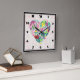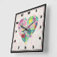 Eine Uhr mit einem illustrierten Herz gefüllt mit Blume und Blätter in rosa, grün und gelb.