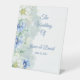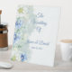 Dieses Hochzeitsschild wird in einem schönen Aquarellblütendruck in Blau und Weiß gezeigt, Text in einer staubblauen Farbe. Passen Sie dieses Element an, indem Sie den Beispieltext ändern und stattdessen Ihre Informationen hinzufügen. Bestandsbild: vecteezy.com