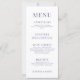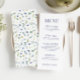 Verstärken Sie Ihr Hochzeitserlebnis mit diesen eleganten, rustikalen Hochzeitsmenükarten in Aquarellfarben, die mit blauen und gelben Blüten geschmückt sind und durch einen raffinierten marineblauen Text ergänzt werden.