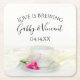 Lassen Sie Ihre Gäste in Ihrem Hochzeitssaison Empfang, Verlobungsfeier oder Brautparty ihre nasse Trinkbrille auf einen personalisierten Blumenteea Cup legen und Rosensträucher Liebe ist Papier-Untersetzer brauen. Diese eleganten, individuell gestalteten Gartengeschirr-Untersetzer verfügen über ein digital bemaltes Blumenfoto mit einer Blumentasse und Untertasse mit rosafarbenen Blume am Stiel und weißem Satin.