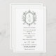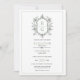 Elegantes Peitschgrün Vintages blumengeschmücktes Wappen Monogramm und Grenzhochzeit Einladung. Die Vintage Blumenarchitektur und das zauberhafte Ambiente des Hauses laden Sie ein. Ein wunderschön gestaltetes Wappen zeigt Ihr personalisiertes Monogramm zusammen mit Ihren Namen in komplementärer grüner Typografie. Eine dünne grüne Grenze rundet das elegante Aussehen ab. Auf der Rückseite bietet ein QR-Code einen schnellen Zugriff auf UAWG und andere wichtige Hochzeitsinformationen.