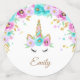 Dekorieren Sie Ihre Party-Tische mit diesen personalisierten Einhornkonfetti-Stücken. Sie sind mit goldenen Glitzern, Regenbogen, einpoligen Gesichtern, lila und aquamarinen Blume und einem bzw. mehreren Namen dekoriert.