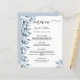 Eine elegante und trendige Hochzeitskarte. Blauer botanischer Blumenkohl, Blätter und Sprigs in Aquarell. Personalisieren und fügen Sie Ihre Namen, Datum und das Hochzeitsmenü. Ein schick weißer Hintergrund. Schwarze Buchstaben. Das Wort Menu wird mit einem modernen Handschrift-Stil-Skript mit Swashes geschrieben. Zurück: ein hellblau-grauer Hintergrund.