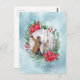Weihnachts Foto Postkarte mit rot grünem Blumenkranz mit Poinsettia, Schneehintergrund, eigenem Foto und personalisiertem Text.