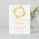 Einladung zum Hochzeitsfeiern mit blumengeschmücktem Kranz aus echter Goldfolie. Es hat einen eleganten Blattkranz, um die Initialen/Monogramm von Braut und Bräutigam hinzuzufügen. Verwenden Sie diese Vorlage, um den Text zu ändern.