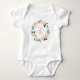 Personalisierter Babybodyanzug mit Monogramm und Name, umgeben von einem Blumenkranz aus Aquarellpfirsich.