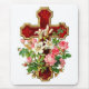 Das Vintage Kreuz aus Rot und Gold mit einer Fülle hübscher Blume wurde sorgfältig retuschiert, um die wunderbaren Details zu verdeutlichen. Es gibt weiße Osterlilien und üppig rosa Rosen.