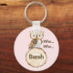 Blumenkronenschale und Personalisierter Schlüsselring Kronenklingelring. Der Eule-Schlüsselring eines Mädchens mit einer Uhu in Aquarellfarbe, die eine Blumenkrone und eine Holzscheibe trägt. Ideal für ein personalisiertes Geschenk.