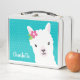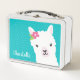 Niedliche weiße Lamaillustration, Blume und aquamariner Polkapunkthintergrundentwurf wird auf diesem kundenspezifischen Kindermittagessenkasten gekennzeichnet. Personifizieren Sie leicht mit einem Namen!