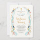 Schöne Wildblume-inspirierte Taufveranstaltung mit einem Rahmen aus blauen Lorbeeren, rosa Wildblumen und Goldakzenten. Die zarten handgemalten Krawatten umgeben Ihren Text, der Ihren besonderen Tag verkündet - mit einem Kreuz oben im Rahmen. In schöner Blues, Rosa, Golden und Braun mit Birkenholzkorn auf der Rückseite.