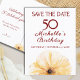Feiern Sie 50 unglaubliche Jahre mit dieser eleganten, blumengeschmückten Save the Date Karte. Dieses Design mit seiner sanften gelben Aquarellblüte und der gepflegten, modernen Gestaltung eignet sich hervorragend für Meilensteine-Feiern, von schicken Party bis hin zu intimen Ansammlungen. Vollständig anpassbar mit Ihren Veranstaltungsdetails. Viel Spaß!