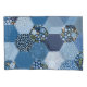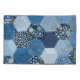 Patchwork-Muster mit Blumenmuster- und Denim-Patches in blauen Farben. Nahtloses Design für Gewebe und Textilien. Blumen- und Denim-Fliesen in Blau: Stilvolle und strukturierte Dekoration. Denim und Blumenmuster harmonieren perfekt. Ein modisches Statement, ideal für die Textildekoration: Steppdecke, Flickwerk, Hexagon, Pflaster, Denim, Textur, Teppich, Stoff, Muster, Illustration, Decke, Hintergrund, abstrakt, Blume, Dekoration, Vintag, floral, kreativ, nahtlos, blau