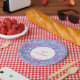 Moderne, rosa und weiße botanische Wildblume auf einem halbblauen Hintergrund für einen frischen und fröhlichen Sommerlook. Koordination hübscher Teller mit Texten, die zu Anzug Ihrer Feier verändert werden können.