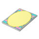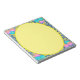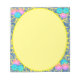 Das Blumendesign auf dem gepunkteten Hintergrund macht dieses gelblich grüne Notizblock zu einem dekorativen ovalen Bilderdesign. Eine nette, lebendige Veränderung gegenüber dem normalen, wenn man entscheidet, was man auf eine Lebensmittelliste setzt, Telefonnachrichten nimmt oder für alles andere, was man sonst noch aufschreiben muss.