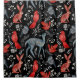 Eine illustrierte schwarze Hintergrundgestaltung mit roten und blauen Vögeln, einem Hasen und einem Hirsch zwischen weißen Blumendesigns schafft einen wunderlichen Volkskunststil.