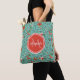 Eine Aquamarine-Totentasche mit hübsch orangefarbenem und pfirsichfarbenem Blumenmuster mit marinierten und grünen Blätter. Personalisieren Sie, indem Sie Ihren Namen und Monogramm in die Kirschtomate Rot abgerundeten Achteck-Abzeichen. Dies ist Teil der Aquamarine Floral Cherry Tomato Red Monogram Collection.
